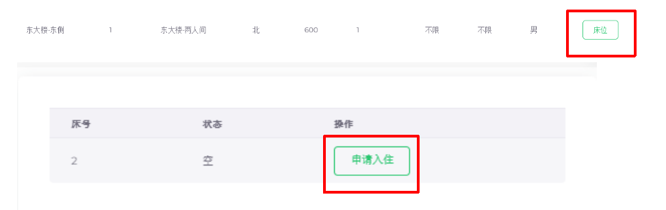 点击空余床位,再点击申请入住,等待审核,审核通过即可。